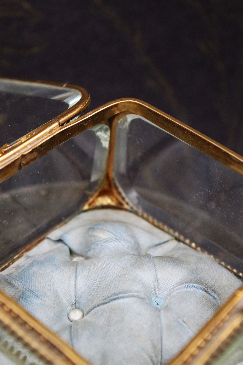 Antique French jewelery box in bronze and faceted glass and silk cushion at the bottom with a fine old patina. H: 9cm. W: 11cm. D: 11cm.