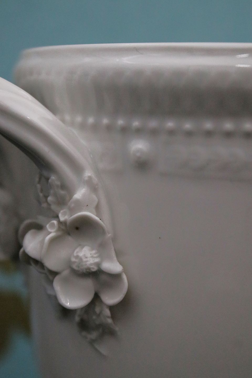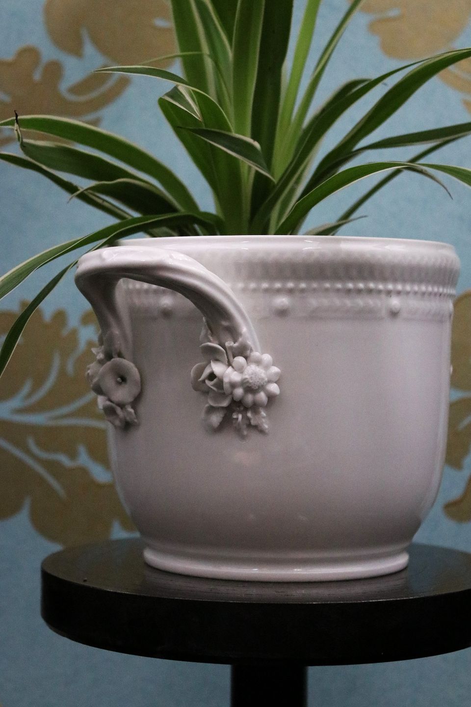 Royal Copenhagen flower pot hider in White Flora Danica with handle.