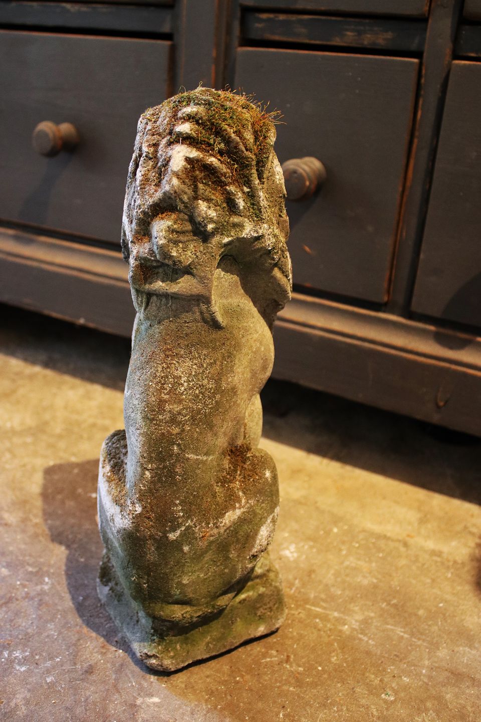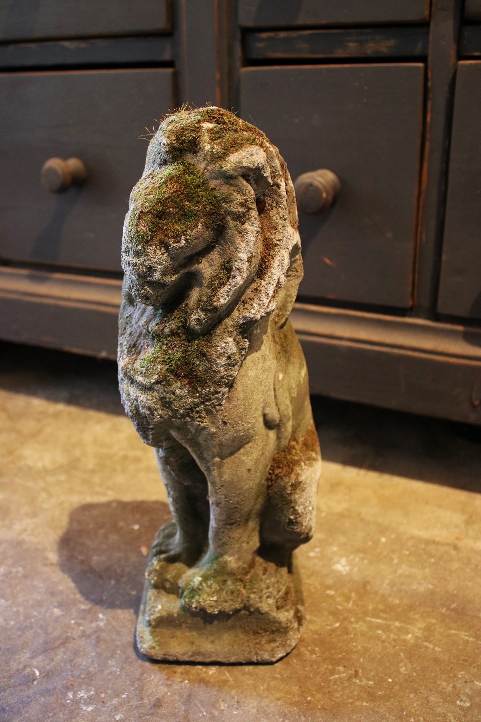 Old French sandstone lion with a super fine patina. Height: 37cm. (Decorative both outside and inside the interior)