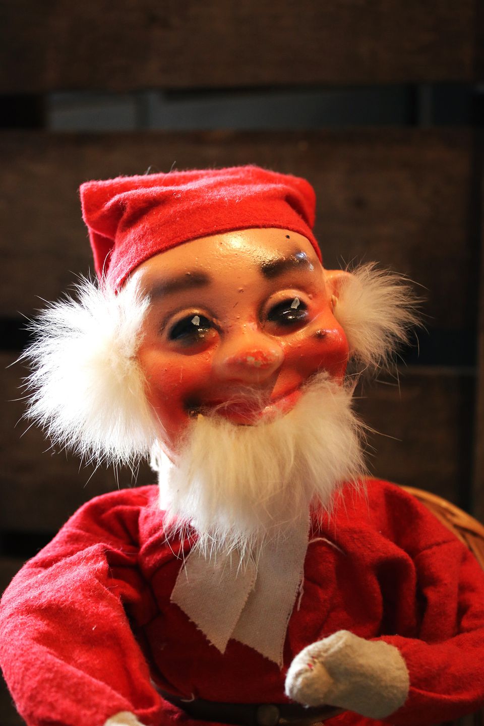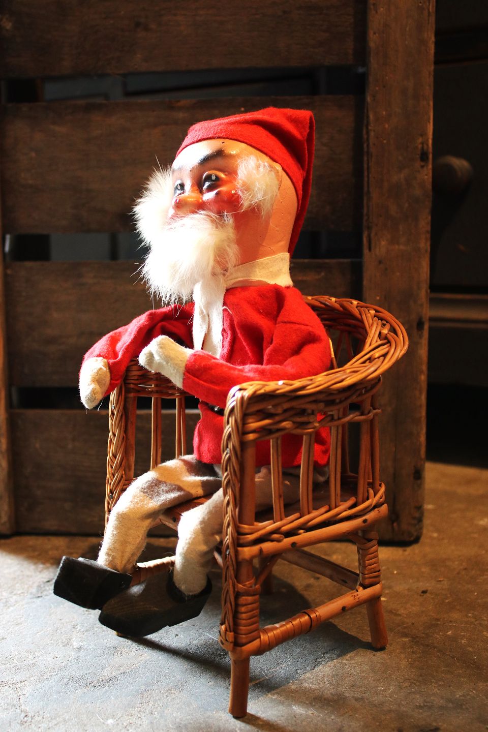 Old shop Santa in felt clothes and clogs sitting in an old wicker chair. Height: 30cm. Item number: Jul nr. 546