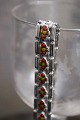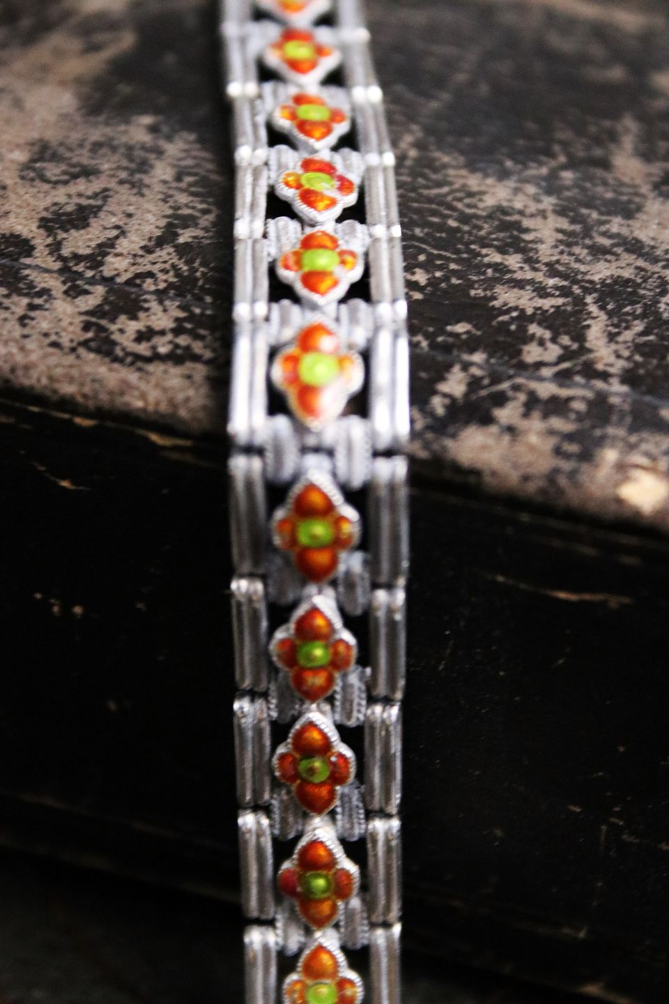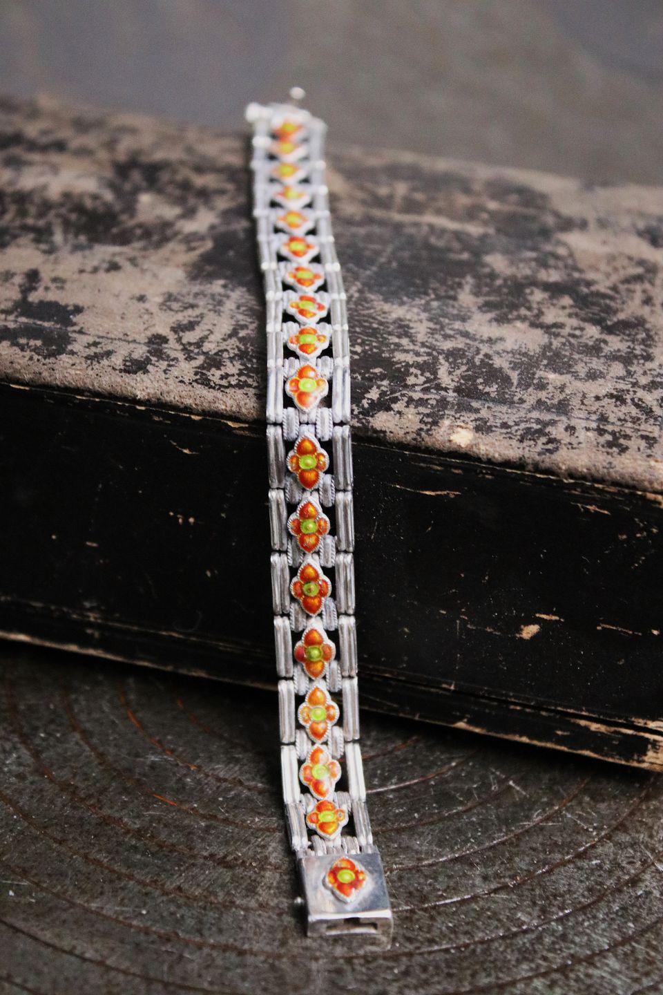 Old silver bracelet with inlaid enamel flowers in orange colour.