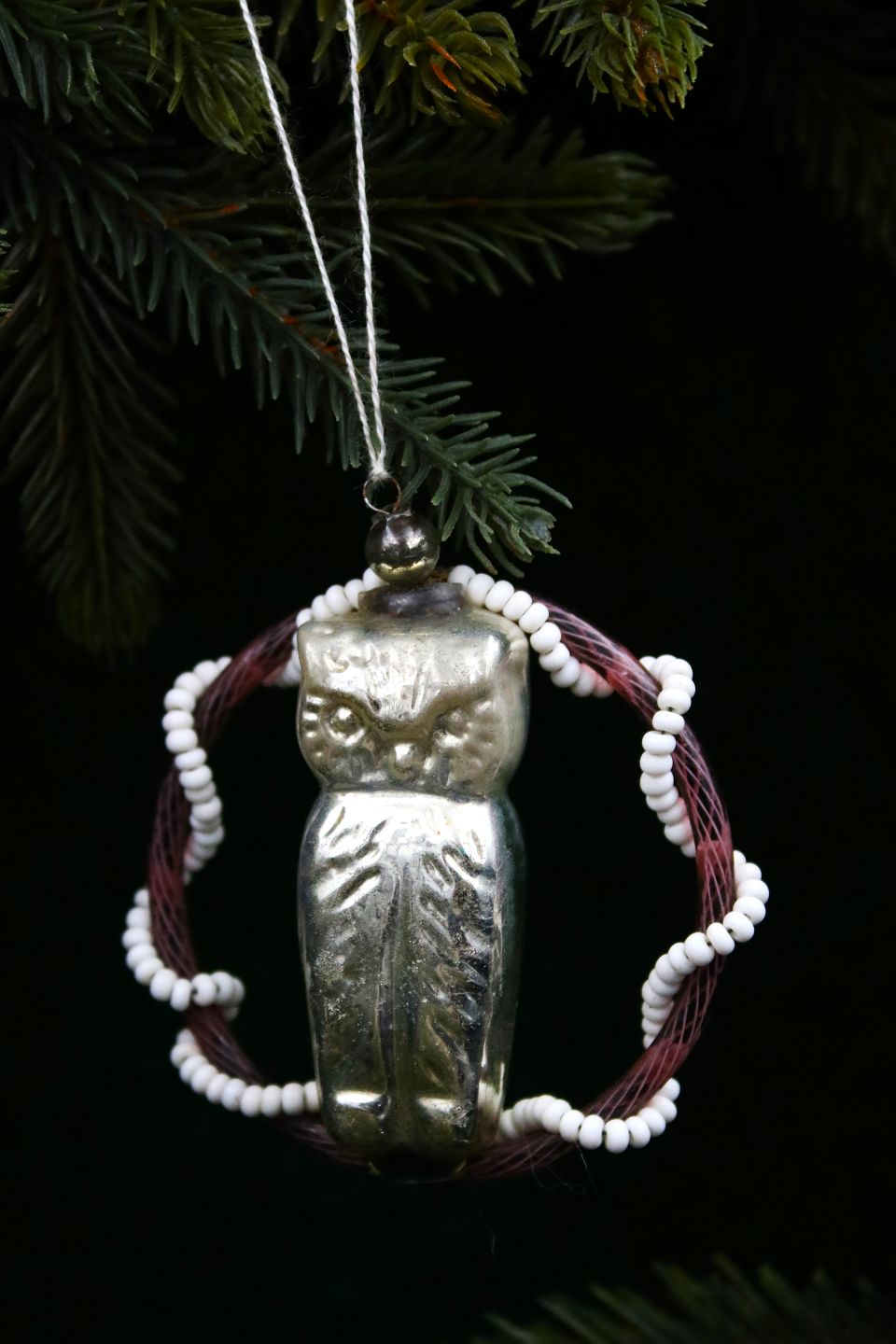 Sjælden glas juletræspynt fra 1940 i form af lille ugle siddende i perle / glas ring. Dia.: 6cm. Emne nummer: Jul nr. 577