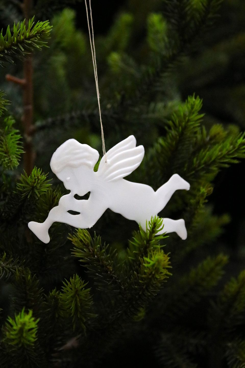 Old Christmas tree ornament in the shape of a little angel playing a trumpet in pearly white plastic from the 50s. Length 8cm.