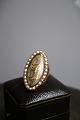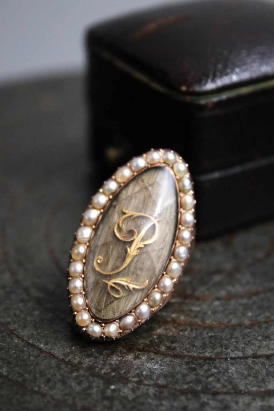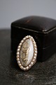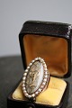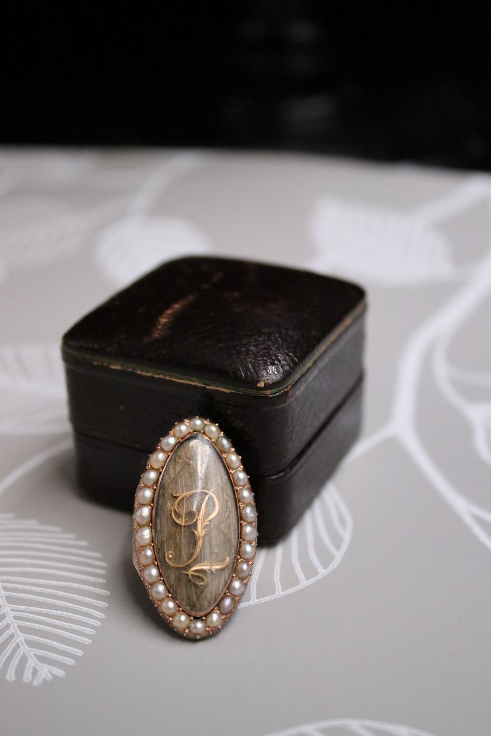 Fantastisk smuk Empire guld ring , år 1810 , dekoreret med små kulturperler , indlagt hår og initial P bag glas. L: 3,5cm. B: 2cm.