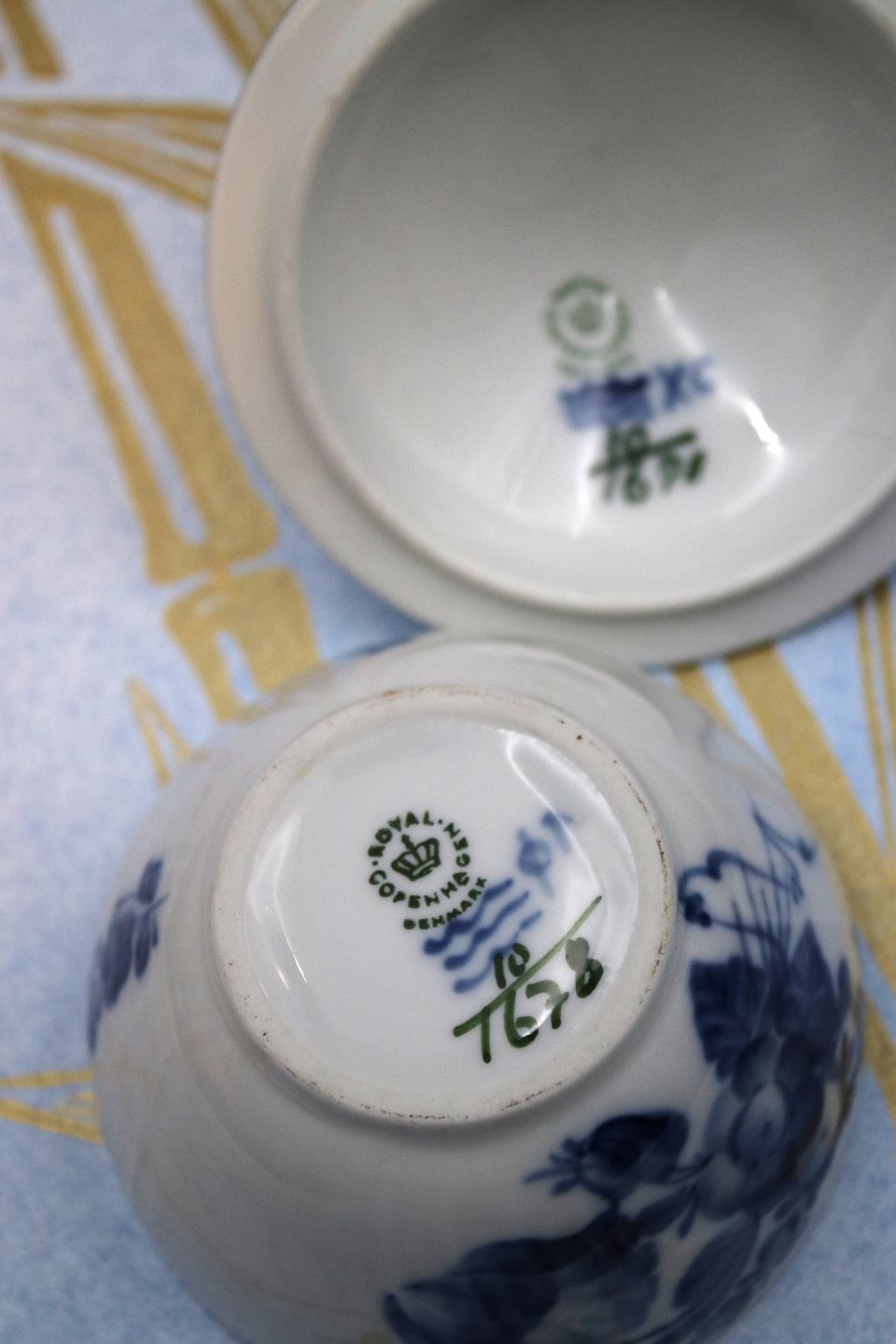 Royal Copenhagen, Blue Flower Curved sugar bowl with lid and gold rim. Decoration number: 10/1678. 1st grade. H: 9.5cm. Dia.: 10cm.
