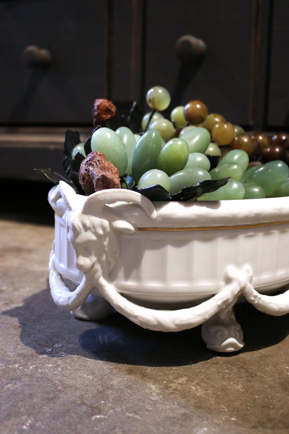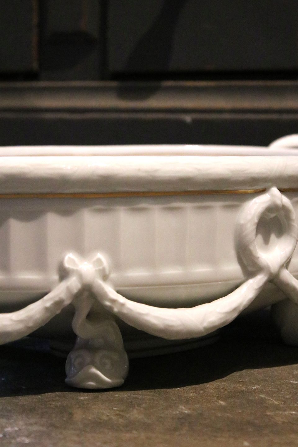 Gammel jardiniere i Hvid Vifte fra Royal Copenhagen i porcelæn med fine detaljer og vædderhoveder i enden. H:12,8cm. 37x24cm.