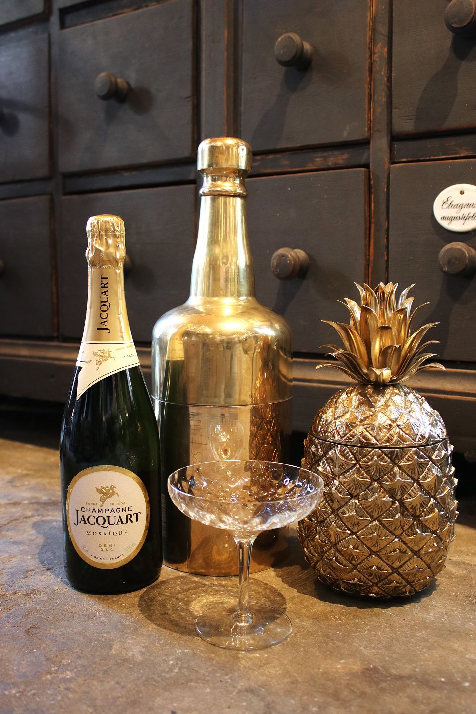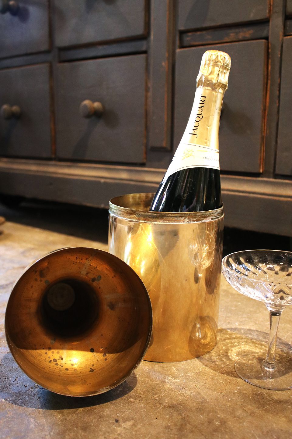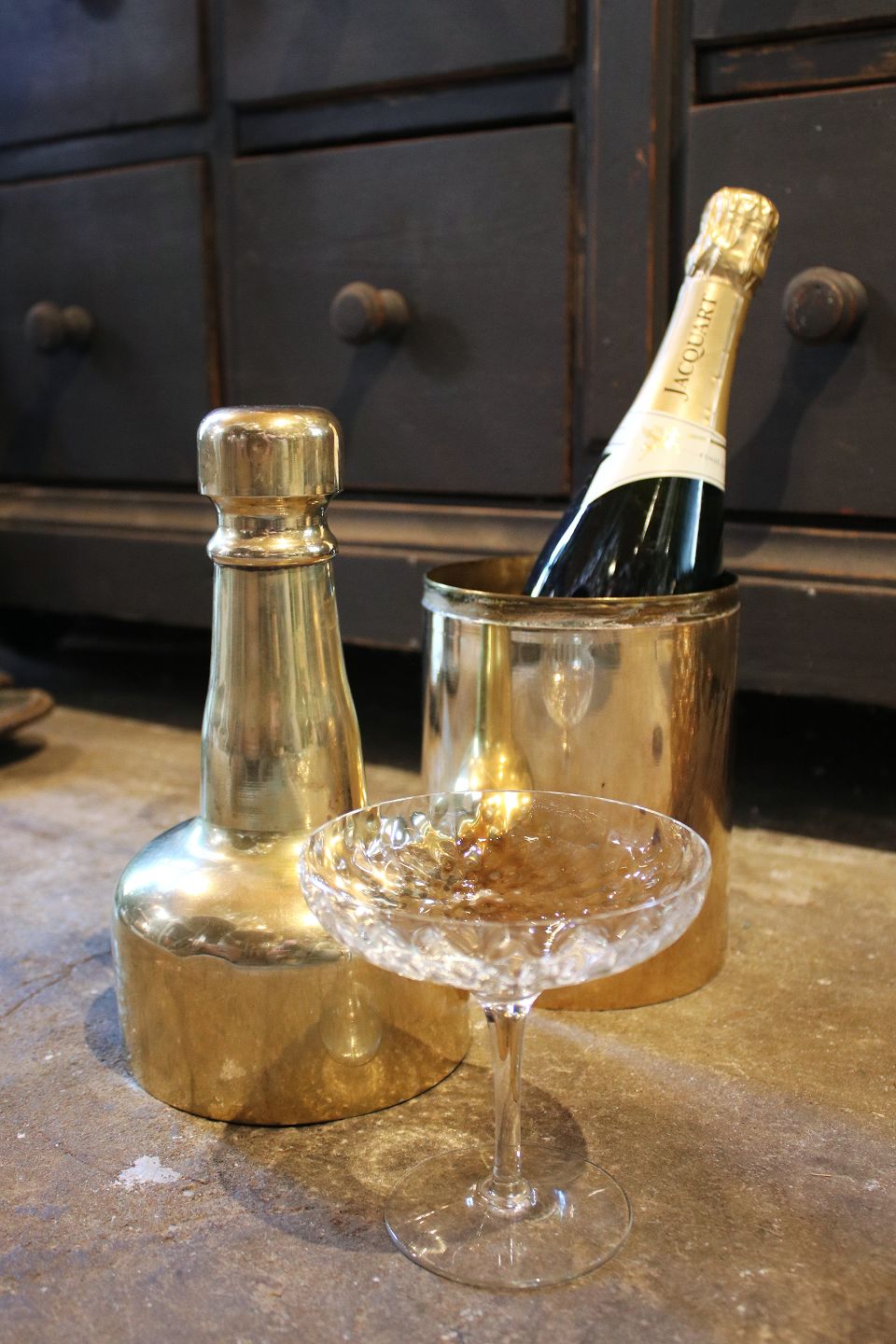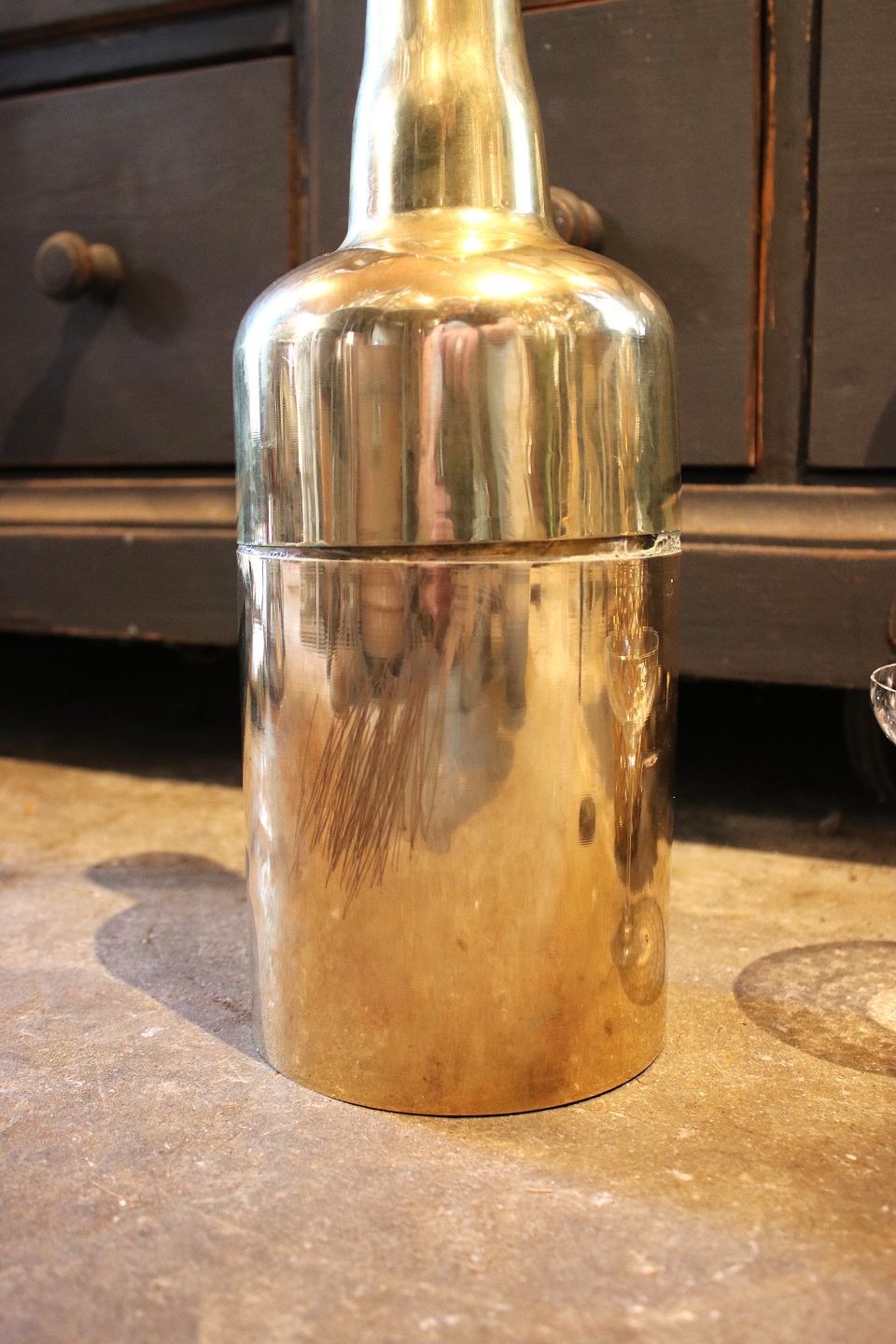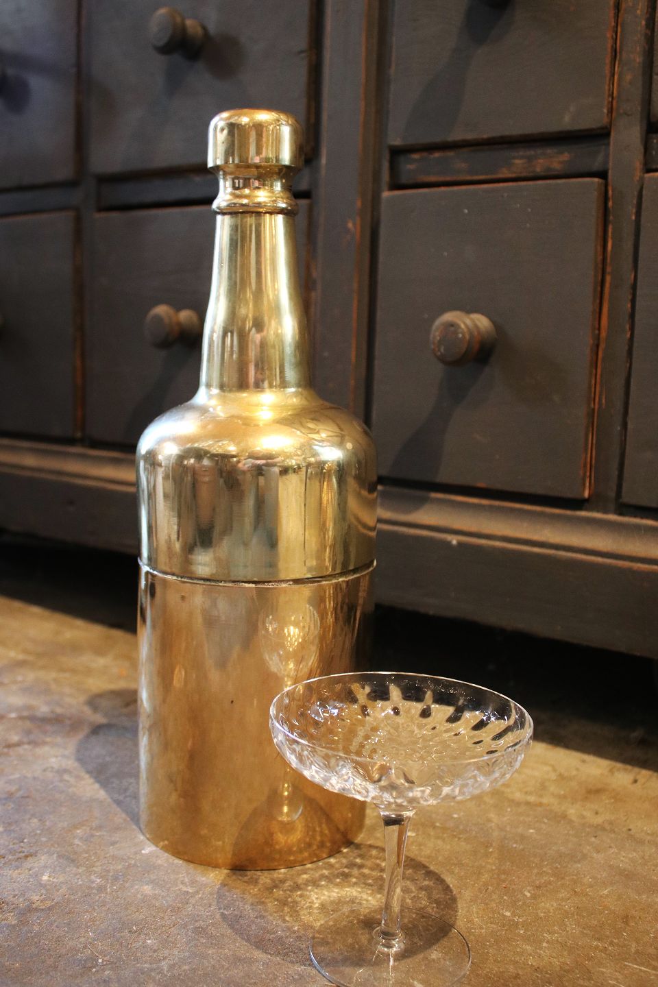 Old champagne cooler in the shape of a large bottle in brass that can be opened and filled with ice cubes. Has patina from use.