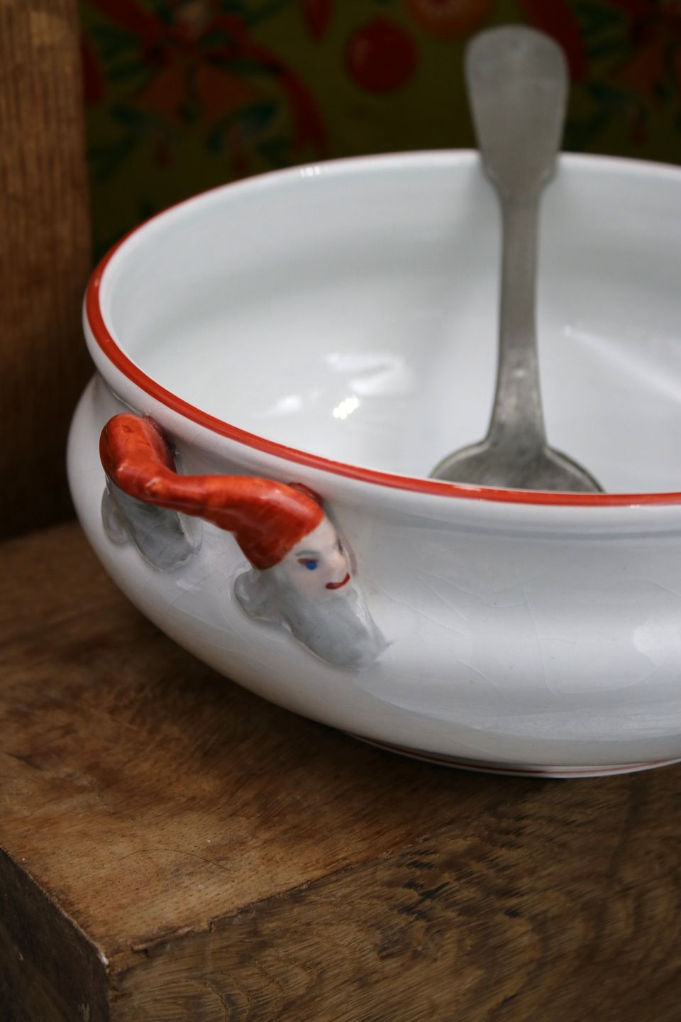 Old Swedish Christmas bowl in faience with a gnome on the handles. H: 7.5 cm. Dia.: 20cm. Item number: Svensk juleskål