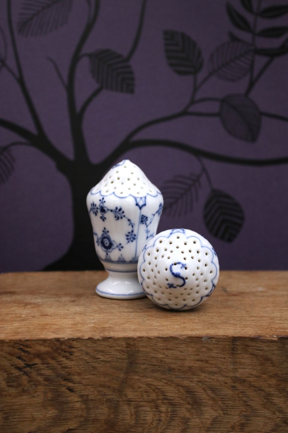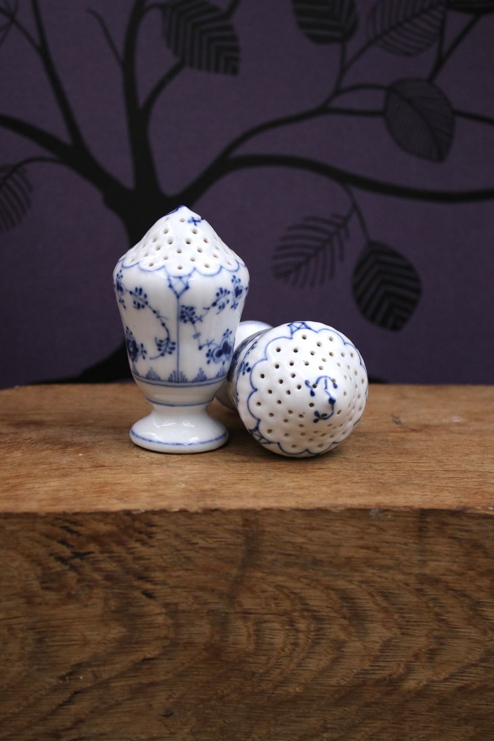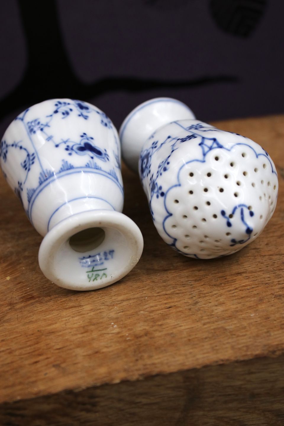 Salt & peber sæt i Musselmalet Riflet fra Royal Copenhagen. H: 8cm. Dekorationsnummer: 1/480 - 467. 1.sort. Emne nummer: RC# 1/480 - 467