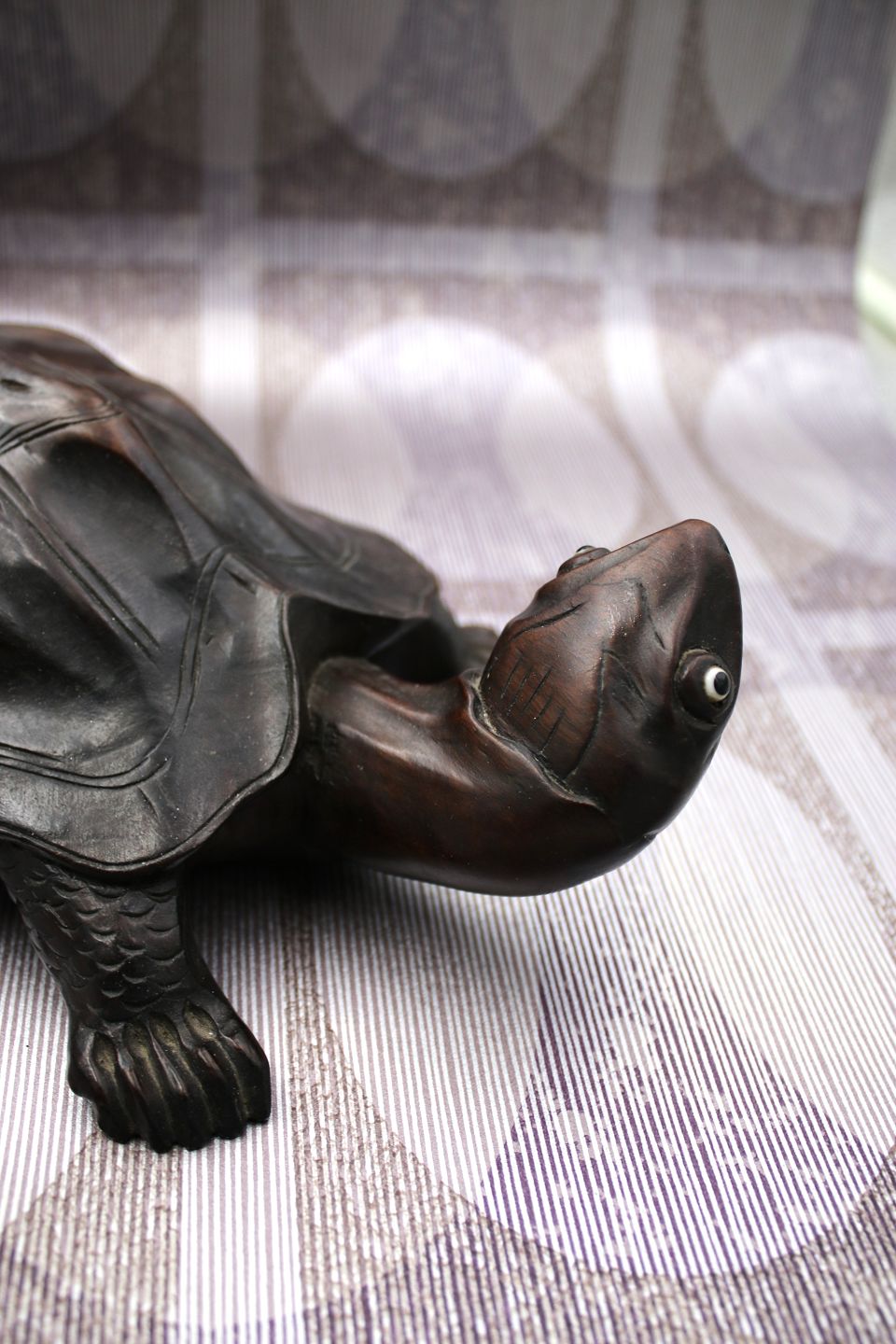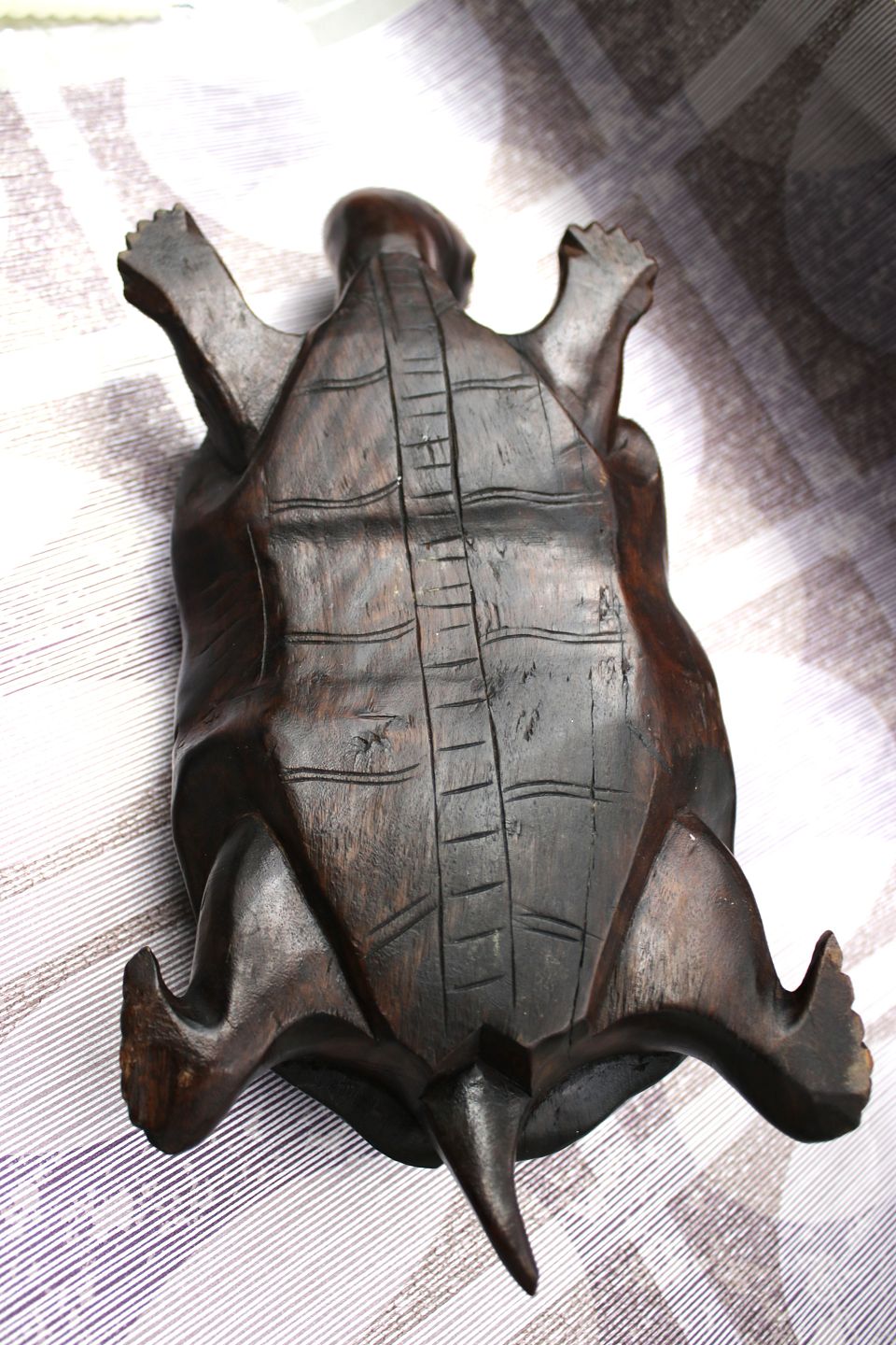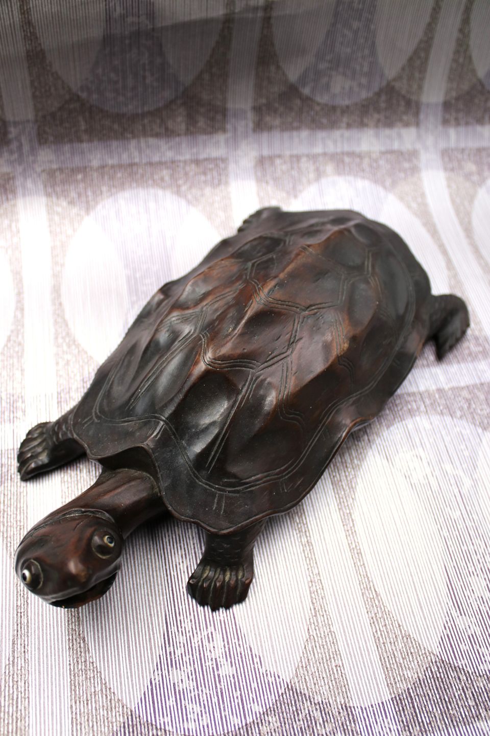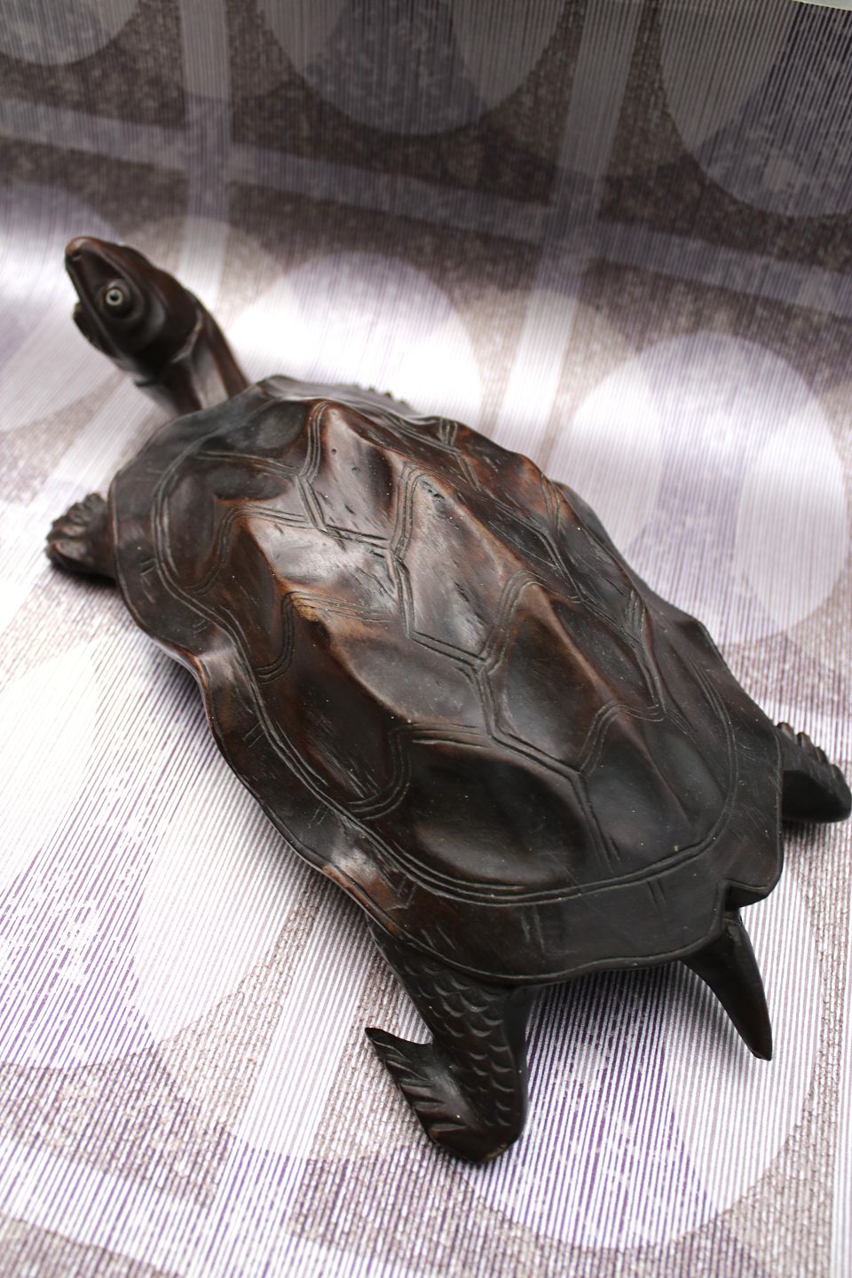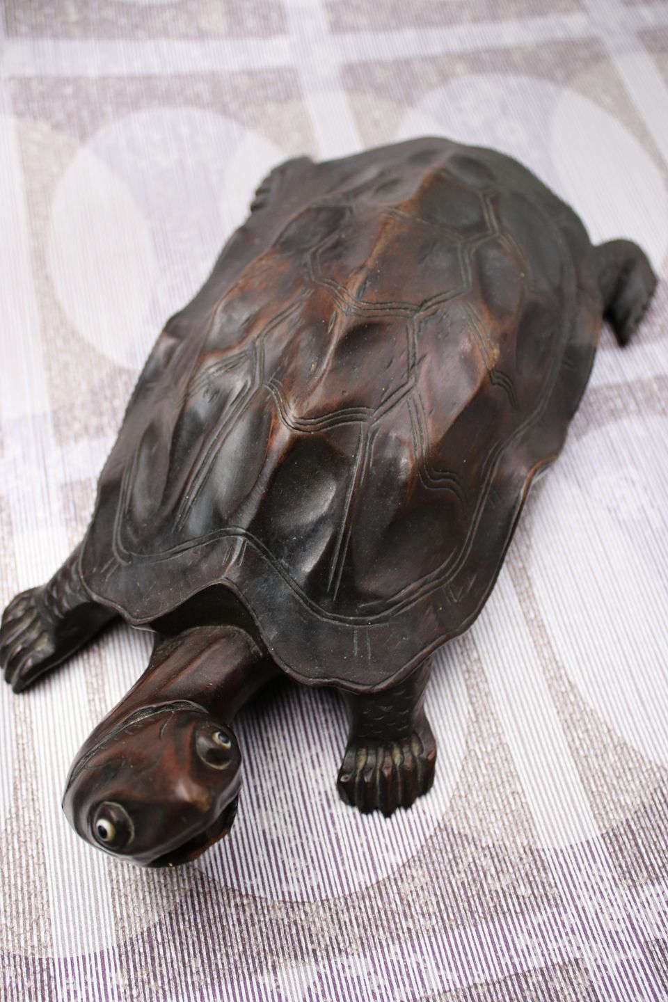 Old turtle carved in solid dark wood with a really nice patina. H: 7.5cm. L: 30cm. W: 15cm.