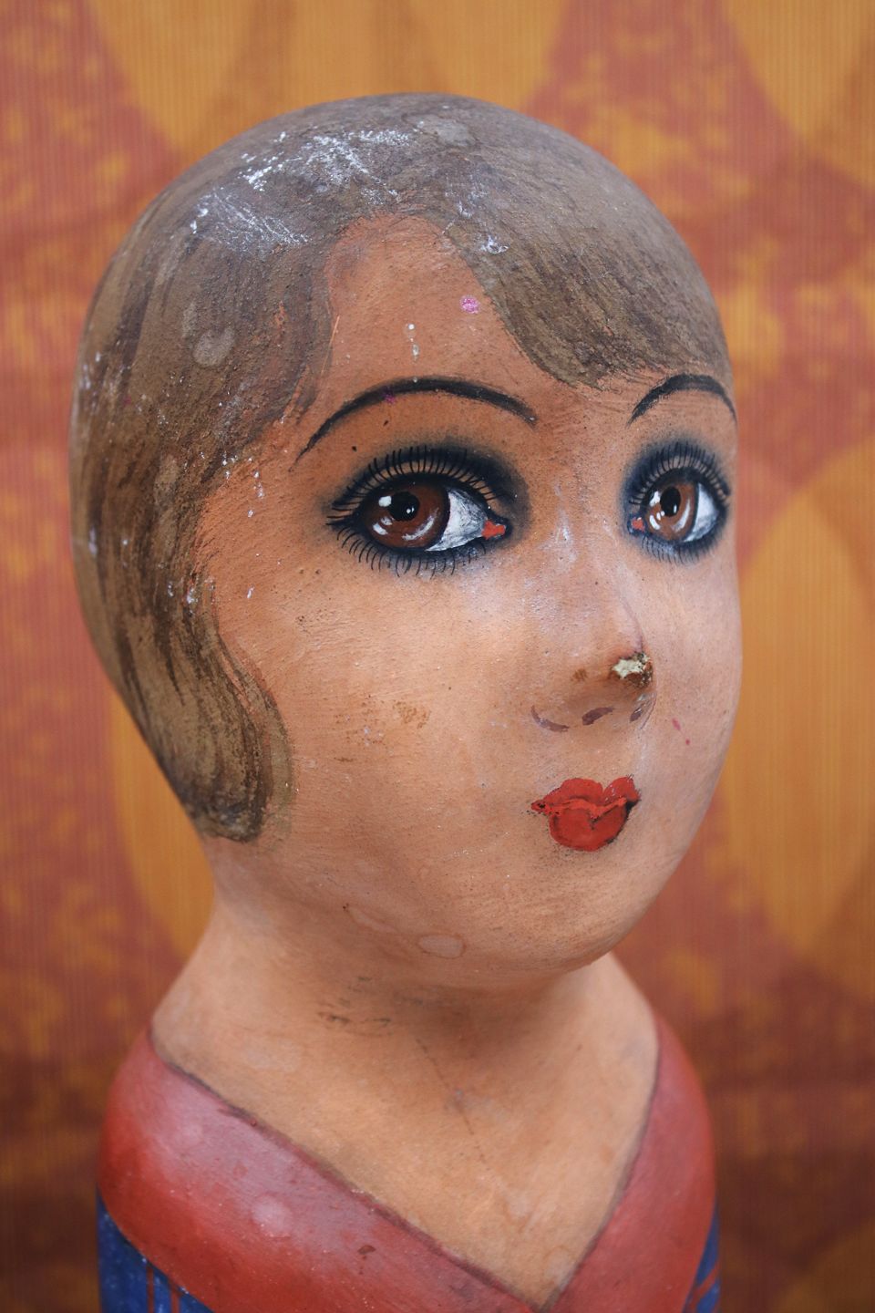 Original, antique French mini wig head (Millinery head) from the 1800s, painted papier-mâché...