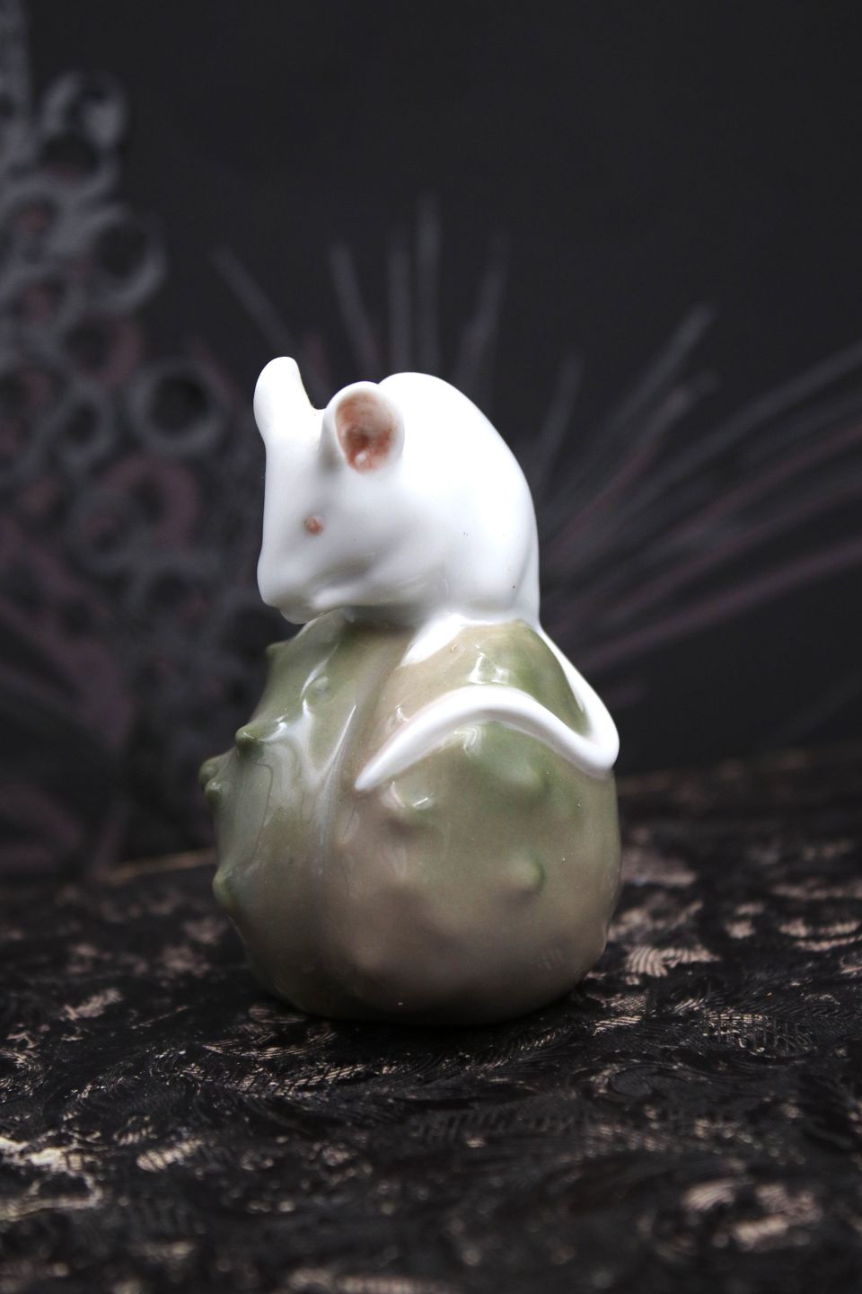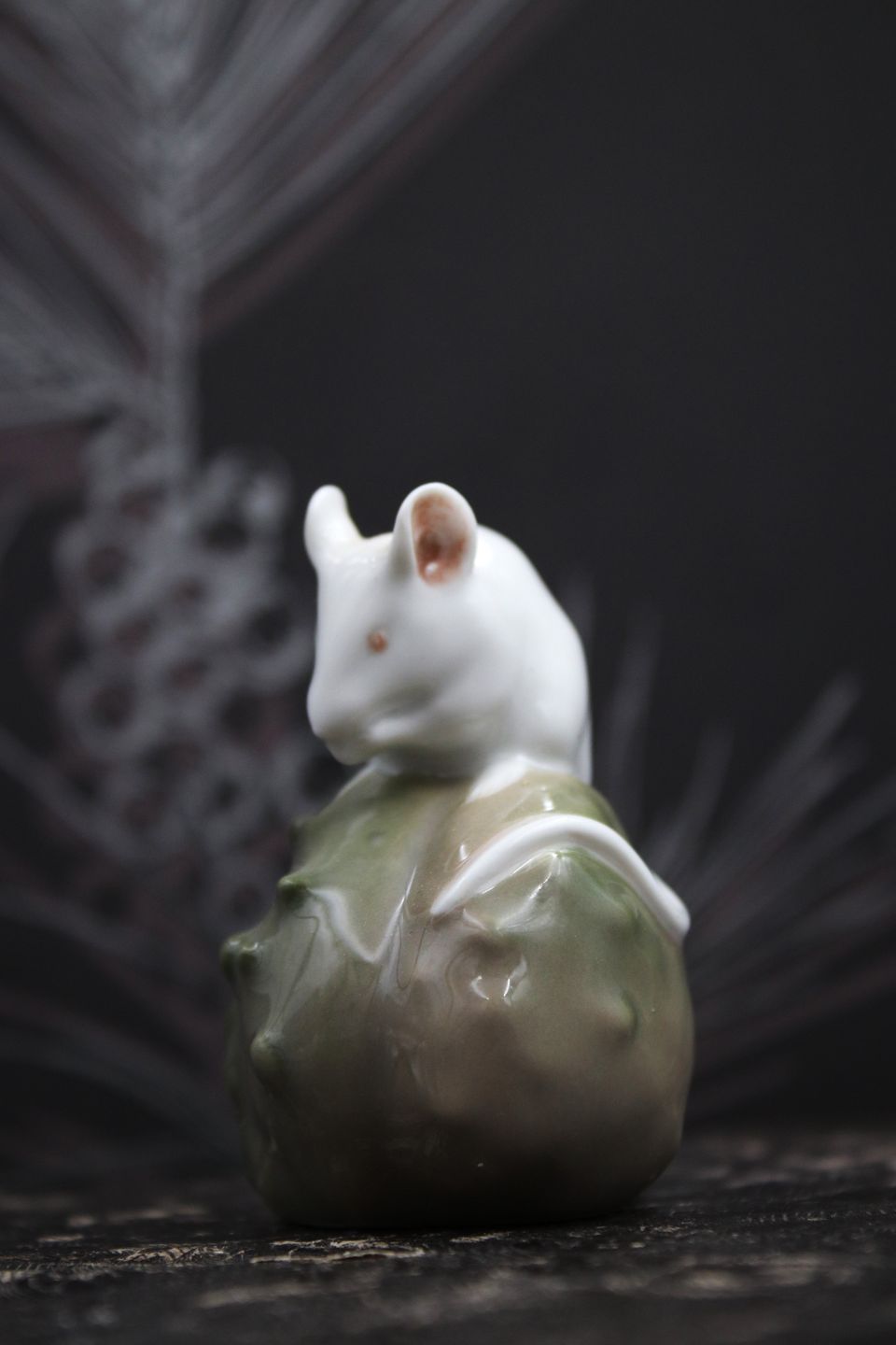 Lille hvid mus siddende på en kastanje , fin lille porcelænsfigur fra Royal Copenhagen. H: 6,5cm. Dekorationsnummer: RC511. fra 1893-1900.