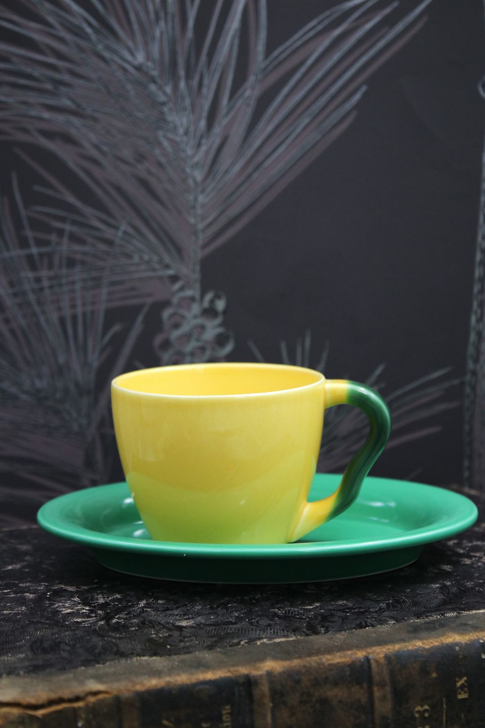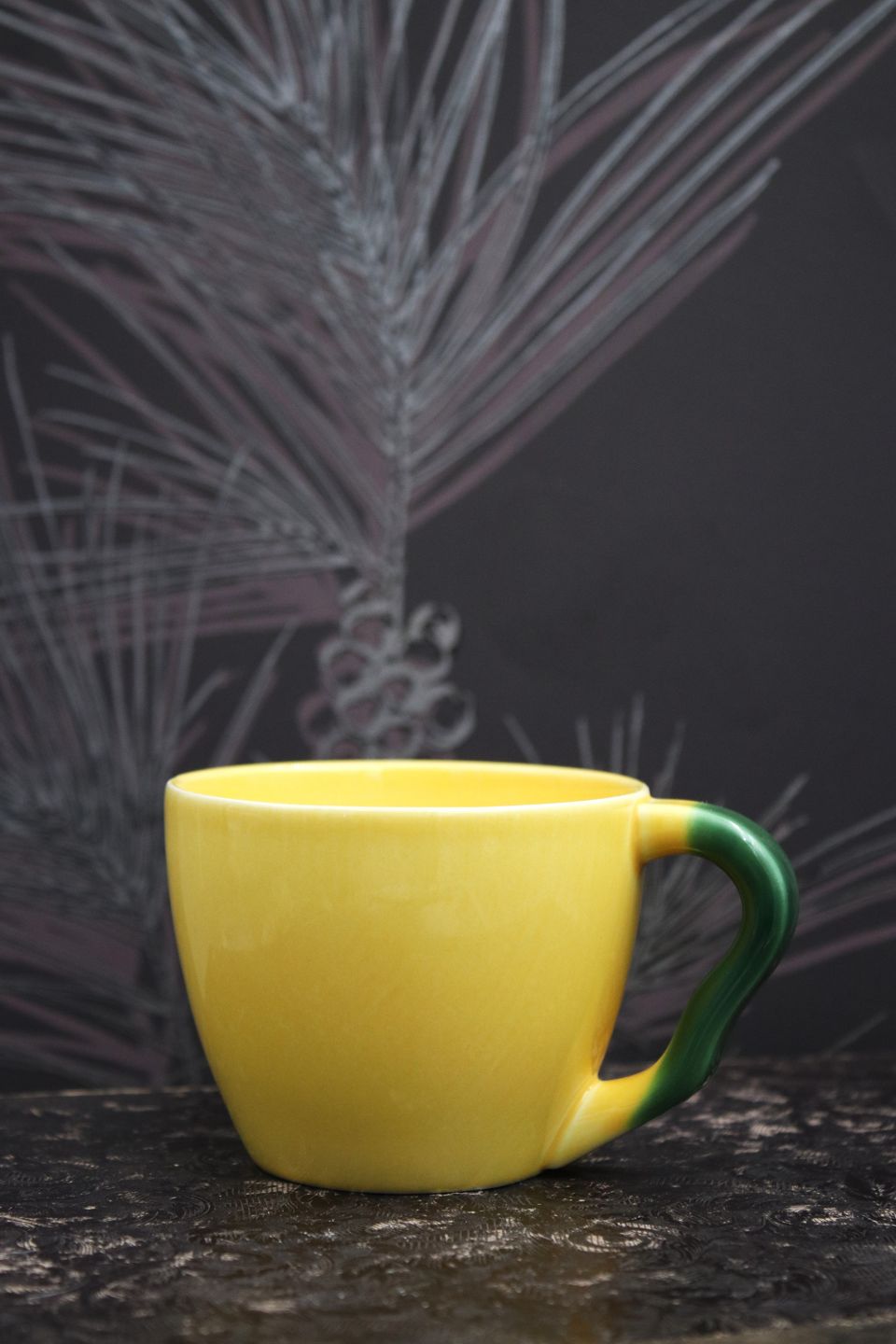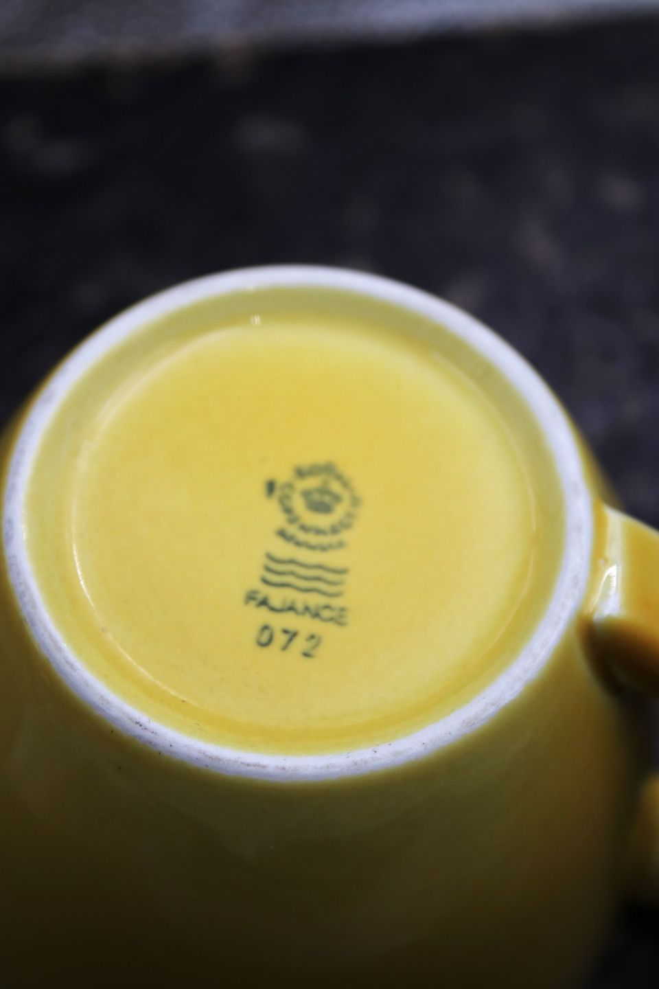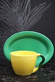 Ursula kaffekop i fajance fra Royal Copenhagen designet af Ursula Munch-Petersen , kaffekop i gul glasur med grøn hank