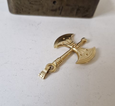 Græsk vedhæng i 14kt guld, udført som dobbeltøkse - Labrys. Øksen kendes fra Kreta - Knossos. Stemplet 585 Vægt 4,7 gram. Længde 5 cm. Bredde 3 cm.