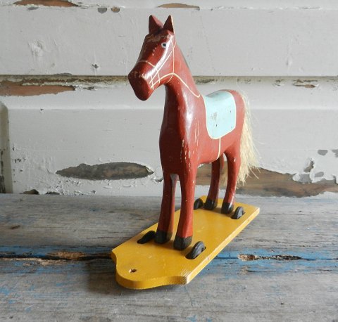 Skøn træhest på hjul, fremstår med originalt flagmærke, fremstillet i Vestre fængsel 1905-77. Højde 20cm. Længde 20cm.