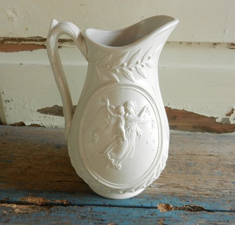 Meget smuk og velholdt fajance mælkekande. Dekoreret med bladværk og Thorvaldsen´s Nat & Dag motiver. Højde 21cm.