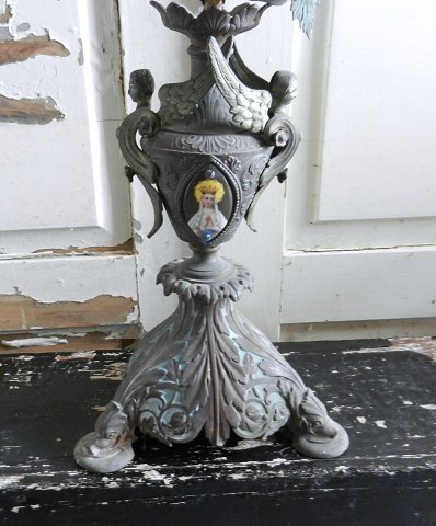 Super flot patineret kirkestage til 7 lys, prydet med 19 blomster. Foden er flot udsmykket med delfiner, engle samt emalje medaljon med håndmalet madonna.