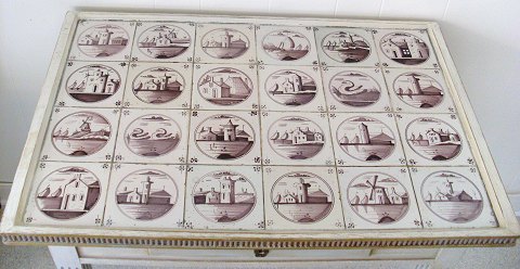 Meget smukt 1800tals gråmalet Gustaviansk flisebord med 24 manganfarvede Hollandske fliser fra 1700 tallet. Mål 56x84cm. Højde 77cm.
