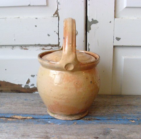 Barselspotte med låg i smuk creme gul glasur. Fremstår med en lille hårrevne samt afslag ved basen. Højde 25cm.