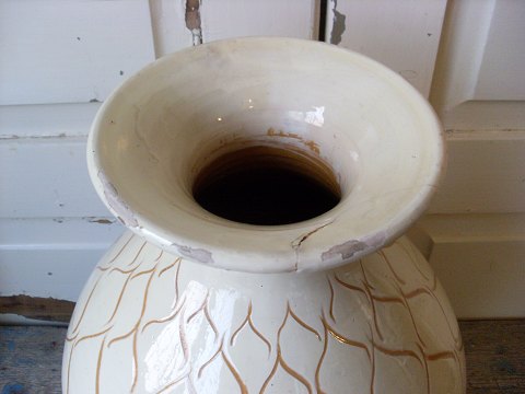 Smuk Kähler gulvvase. Fremstår med gammel reparation, glasur afslag samt lille afslag ved basen, se billed. Højde 38cm.