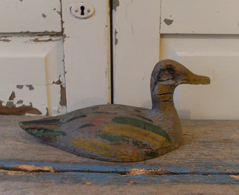 Gammel lokkeand, fint bemalet i grå og grønne farver.