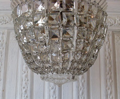 Smuk sækkeformet prisme ampel. Fremstår med et lille afslag, se billed. Ses næsten ikke. Højde 35cm. Diameter 27cm.