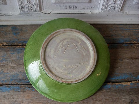 Stort smukt grønt Kähler fad med mønster i relief. Fremstår med nogle små glasur afslag. Diameter 32cm.