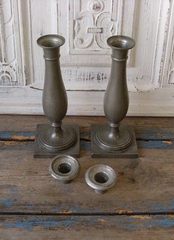 Par stemplede tulipan tin stager ca. 1840. Fremstår med brugs slitage på manchetterne. Højde 22cm.