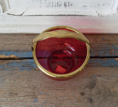 1800tals sukkerskål i hindbærfarvet glas med messing montering.