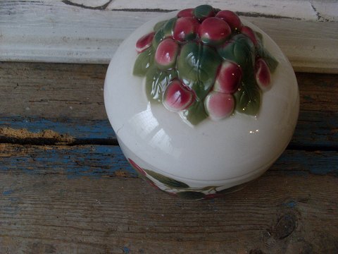 Aluminia marmeladekrukke dekoreret med røde kirsebær fra 1928.