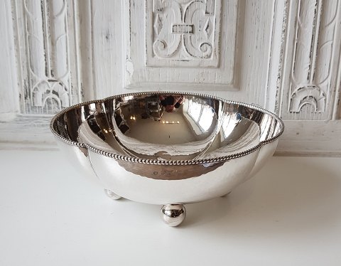 Smuk hammerslået sølv skål med perlekant på kuglefødder.