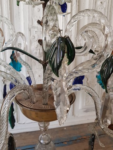 Four light candles, eight swivel arms adorned with numerous colored prisms, leaves and glass of flowers. The chandelier are in good condition, though with damage to prisms and leaves. Two lightbulbs are damaged, but can be easily used.