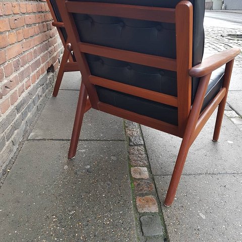 Pair of teak armchairs with black leather cushions