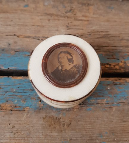 Victoriansk lågdåse i ben og skildpadde forsynet med medaljon på lågets top. Fremstår med enkelte skader. Højde 2,5 cm. Diameter 5 cm.