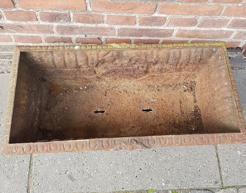 Meget stor fransk havekumme i støbejern fremstår i fantastisk grøn farve. Der er dræn huller i bunden. Højde 36 cm. Mål 38 x 78 cm.