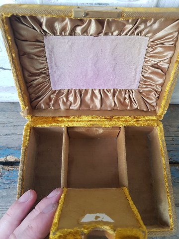 Vintage jewelry box upholstered in golden velor. 3 compartments, space for rings and a medallion or clock. Measure 12 x 16 cm. Height 7.5 cm.