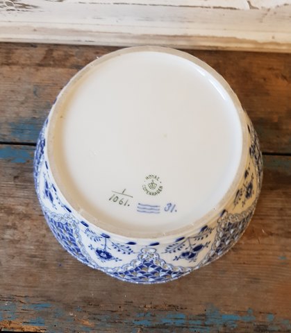 Royal Copenhagen Musselmalet helblonde frugtkurv No. 1061, 1. sort. Højde 9 cm. Diameter 23 cm. Produceret mellem 1898-1923