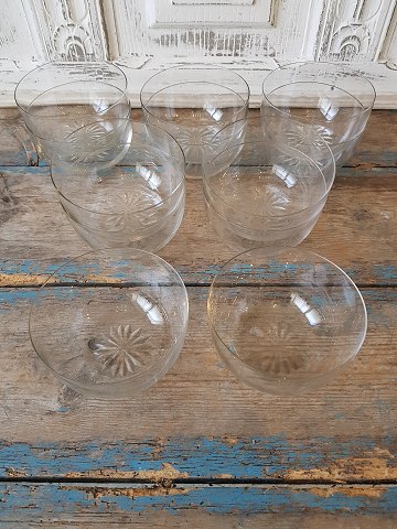Sæt på 12 stk skylleskåle i klart krystalglas med slebet stjerne i bunden. Højde 7 cm. Diameter 12 cm.