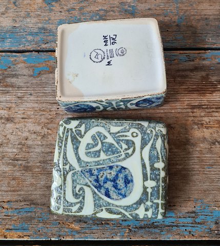 Aluminia Tenera lågdåse dekoreret med fugl. No. 716/3104, 1. sort. Mål 8,5 x 10 cm. Højde 6 cm. Fremstår med lidt misfarvning invendigt - se billed.