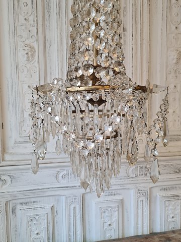 Stor smuk gammel prismelysekrone med tre lyskilder. Fremstår i flot stand. Højde 85 cm. Diameter 26/37 cm.