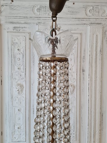 Stor smuk gammel prismelysekrone med tre lyskilder. Fremstår i flot stand. Højde 90 cm. Diameter 36 cm.