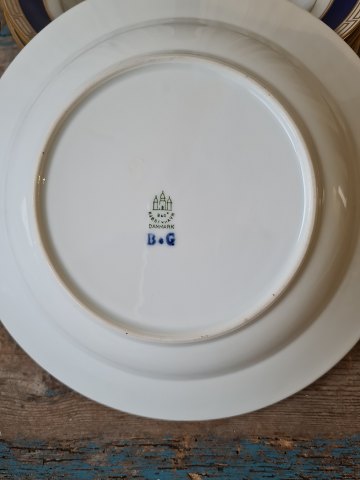 Set på 6 B&G dybetallerken dekoreret med kongeblå fane, græsk evighedsmønster og våbenskjold i guld 24,5 cm.