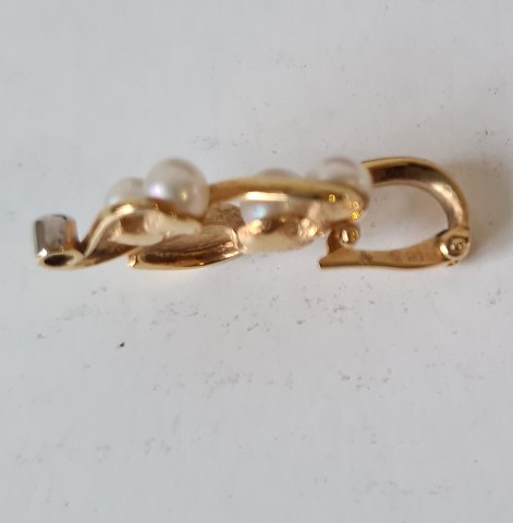 Vedhæng i 14 kt guld med 2 brillanter, 4 perler og opal. Øsknet kan lukkes op så det kan sættes på en perlekæde. Stemplet: 585 Mål 14 x 25 mm.