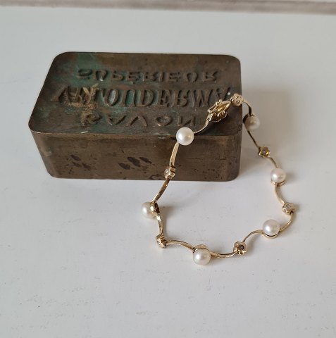 Bernhard Hertz smukt og feminint vintage armbånd i 14 kt guld med 6 perler og 6 brillanter. Stemplet: BH - 585 Længde 19 cm. Bredde 1 - 5 mm.