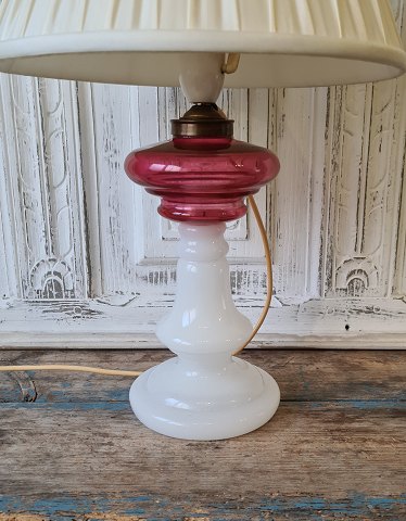Smuk 1800tals opaline lampe med oliebeholder i rosa/hindbær farvet glas.