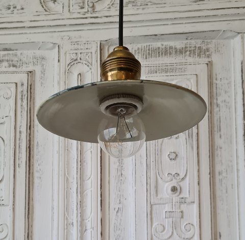 Beautiful old small pendant, socket in brass with green enamelled shade in metal. Height 6 cm Diameter 15.5 cm.