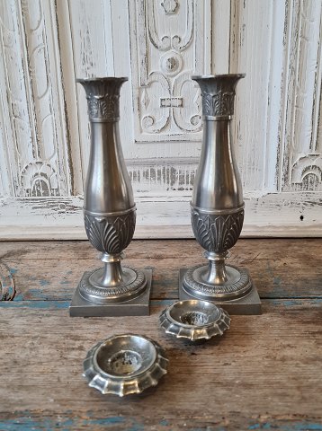 Pair of very beautiful 1800s tulip-shaped pewter candlesticks, decorated with acanthus leaves
