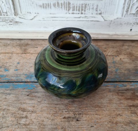 Kähler kohorns decorated vase in green and blue colors Stamped: HAK Height 11.5 cm. Dniameter 14 cm.