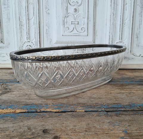 Stor jardiniere af slebet krystal med forsølvet kant Det meste af sølvet er pudset af, meget fin patina. Mål: 16,5 x 36 cm. Højde 10 cm.