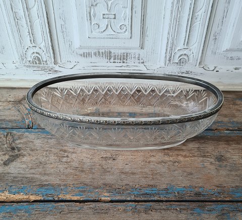 Stor jardiniere af slebet krystal med forsølvet kant Det meste af sølvet er pudset af, meget fin patina. Mål: 16,5 x 36 cm. Højde 10 cm.
